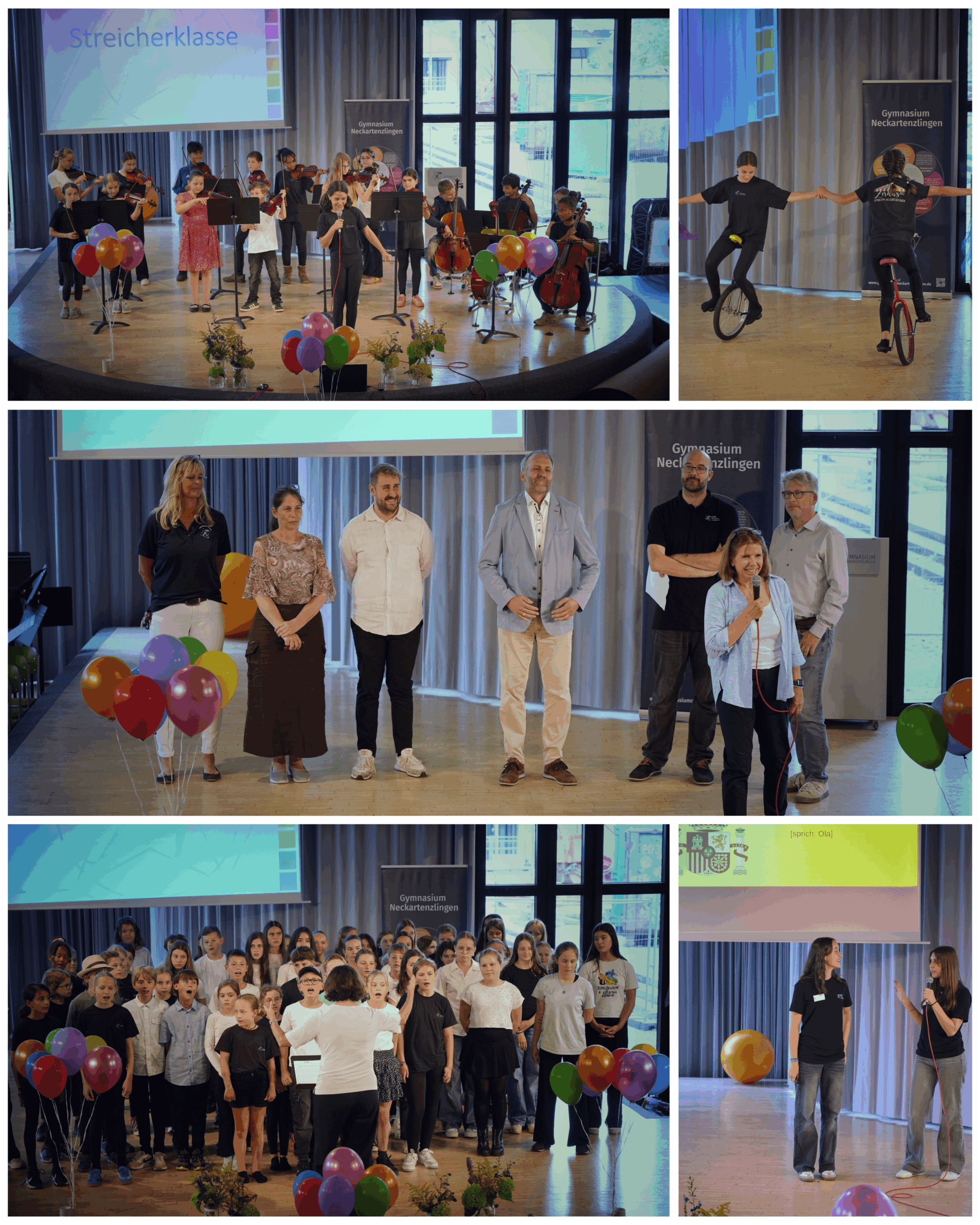 Mit Musik, Bewegung und vielen freundlichen Gesichtern wurden am 28. Juli die neuen Fünftklässler*innen willkommen geheißen. Schon beim fröhlichen Sprach- und Bewegungsspiel der WSB-Mentorinnen war klar: Hier wird Vielfalt großgeschrieben. Ob Unterstufenchor, Streicherklasse oder Zirkus-AG – die Beiträge unserer Schüler*innen sorgten für eine feierliche, fröhliche und manchmal auch atemberaubende Atmosphäre. Weiterhin stellten sich Klassenlehrkräfte, Schulleitung, SMV und weitere Mitglieder der Schulgemeinschaft, z.B. das Mensa-Team vor. Herzlich hieß auch unser neuer Schulleiter Ralph Mülherr alle Anwesenden willkommen und richtete seine Dankesworte an alle, die den Start am Gymnasium begleiten, sowie vor allem auch an Monika Scheubel, die bis zum Ende des Schuljahres die kommissarische Schulleitung inne hatte.