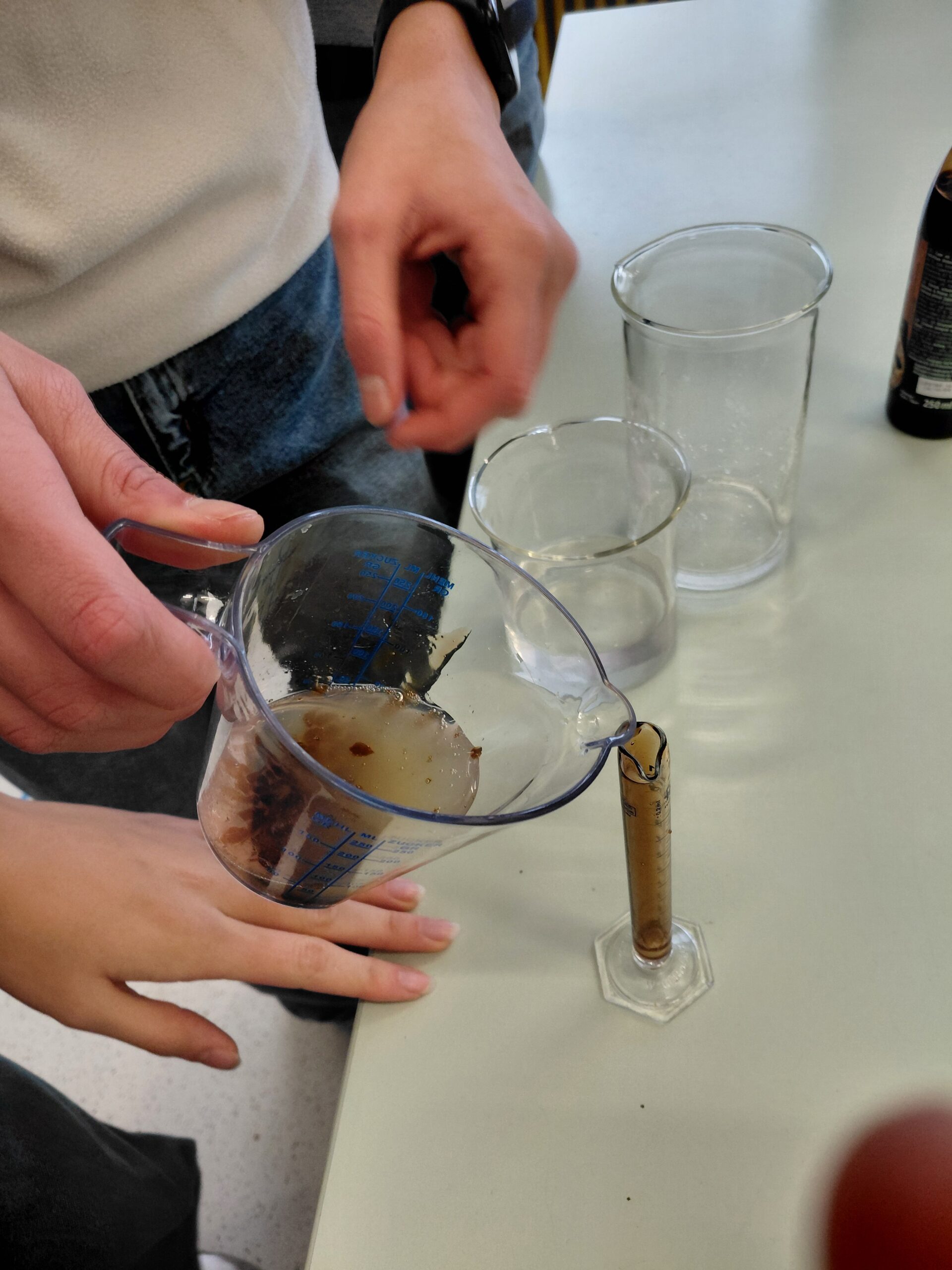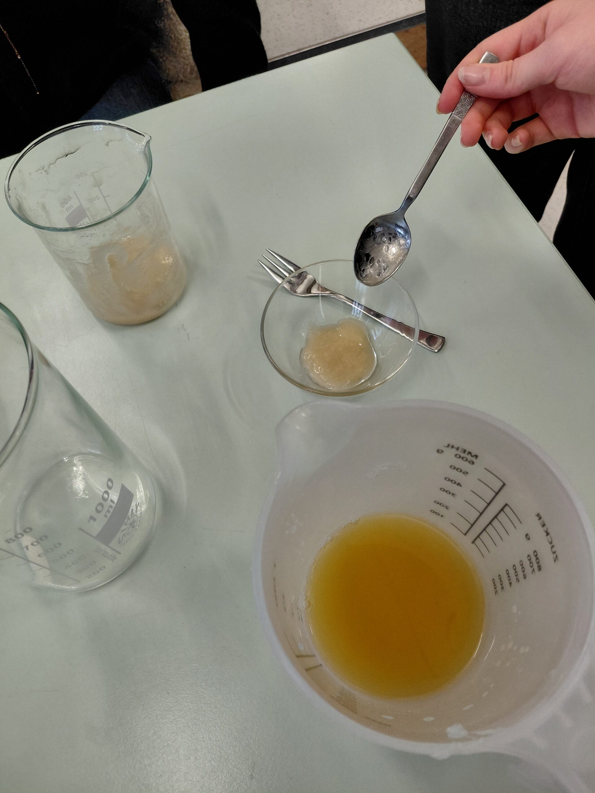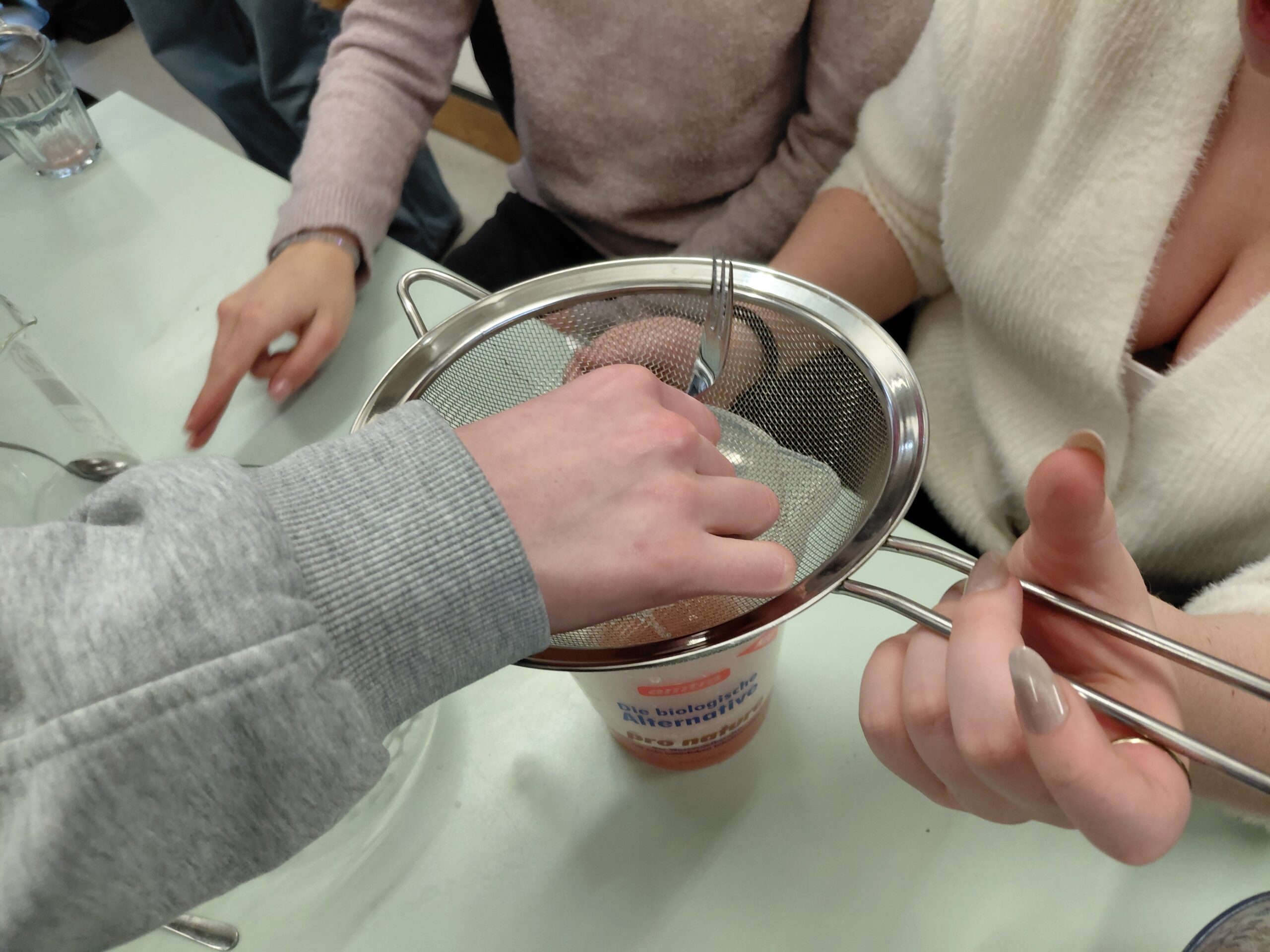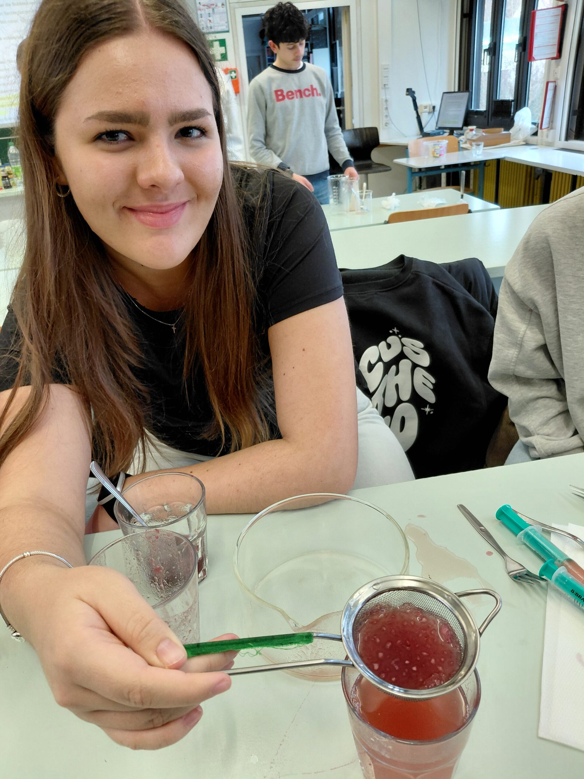 Dabei stellten sie die Perlen des Bubble Tea (sog. Popping Boas) mit Saft bzw. Sirup oder Essig in einer Hülle von Natrium-Alginat, einem natürlichen Extrakt aus Braunalgen, her. Über verschieden Zwischenschritte, Ausprobieren & Abändern der Rezeptur konnte schließlich ein vorzeigbares Produkt hergestellt und natürlich am Ende auch verkostet werden.