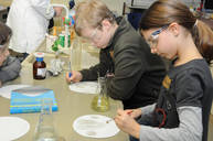 Die Vorfreude und Aufregung der Grundschulkinder ist immer groß, gilt es doch, „echte“ wissenschaftliche Versuche kennenzulernen. Nach der Begrüßung durch Frau Frank, Chemielehrerin am Gymnasium, bekommen die Schüler zuerst eine Geschichte erzählt: Ein Kriminalfall soll gelöst werden! Dazu müssen 3 verschiedene Proben, am Tatort gefunden, chemisch untersucht werden, um den Täter zu entlarven. Fachmännisch betreut von den Mentoren und ausgestattet mit Schutzbrillen, Reagenzgläsern, Pipetten und Bunsenbrennern lernen die Schüler, jeweils in kleinen Gruppen, den ersten Umgang mit chemischen Substanzen kennen. Selbstverständlich gelingt es am Ende allen jungen Wissenschaftlern, die richtige Spur zu finden und damit den Fall zu lösen!